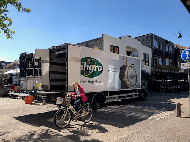 Foto’s: huidige bevoorradingshinder tijdens venstertijden, na herinrichting en versmalling hebben fietsers en voetgangers nog minder ruimte, het bevoorradingsverkeer blijft