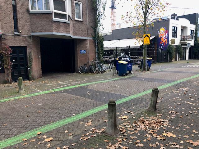 Foto’s: groene strepen geven een indruk van de versmalling van de rijloper na herinrichting. Terrassen van gevel tot rijloper krijgen nog meer ruimte