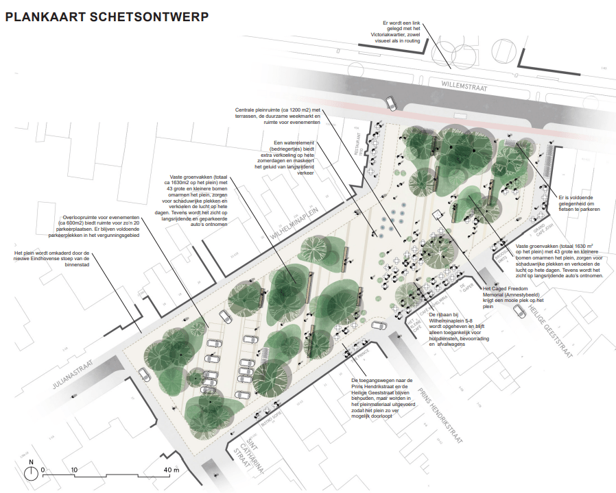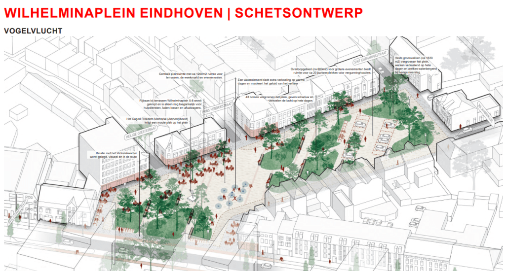 grens?), het Amnestybeeld krijgt een nette plaats, waterpartij (bedriegertjes) en veel groen (bomen en struiken) om hittestress te voorkomen en bankjes voor wie niet verplicht wil worden een consumptie te bestellen… en dan de auto. Daar ging het mis. Naast het verdwijnen van de betaald parkeerplaatsen aan de zijde van de Willemstraat verdwijnen er in dit ontwerp ook veel plaatsen voor ons, de belanghebbenden parkeerders en ons bezoek. Van de huidige 43 plaatsen blijven er ongeveer 20 over! Helaas kon de gemeente bij monde van projectleider Mark Hamelers geen op locatie en aantallen gebaseerde onderbouwing presenteren die dit probleem zou oplossen. Hij kwam niet verder dan dat onze parkeervergunningen gelden voor het hele gebied De Bergen en bewoners daar dus maar een plekje moeten gaan zoeken. Wij weten allemaal dat dat niet gaat werken. Het is ‘nog maar’ een eerste ontwerpschets. Dus wil je het plan in detail bekijken en er je mening over geven? Dat kan op de website van de gemeente: openeindhoven.nl/wilhelminaplein