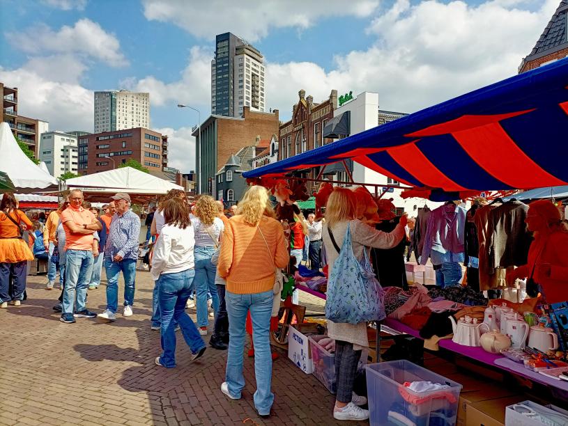 Op het Wilhelmina plein was er wel sprake van een kleine markt, maar dit leken dezelfde kraampjes die je op elke andere markt ook kunt vinden. De typische kleedjes waren afwezig. Alhoewel er wel een kleedje op de Sint Catharinastraat lag, er was slim gebruik gemaakt van de bouwhekken, die al lange tijd in de straat staan. Er hingen namelijk kleerhangers aan met kleding, klaar om verkocht te worden.