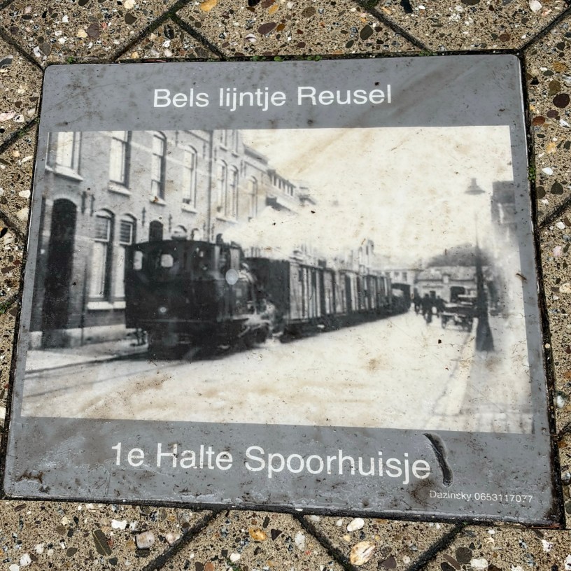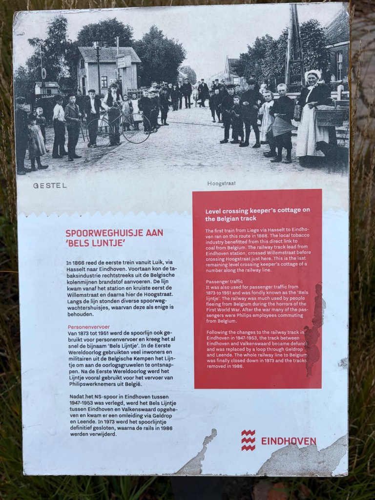 De plaquette bij het bewaard gebleven spoorhuisje vermeldt uitvoerig de geschiedenis van de spoorlijn – die in de volksmond bekend stond als “Bels Lijntje”- die vanuit Luik via Hasselt naar Eindhoven liep en aldaar bij het station uitkwam. Maar de tramlijn over de Kleine Berg ging toch echt van Eindhoven naar Reusel en stond wel bekend als “Acht Zalighedenlijntje”, genoemd naar de kempische dorpen in de streek waar de tramlijn reed. En deze had geen halte op de Kleine Berg!