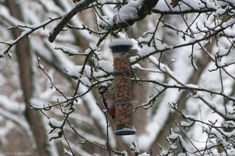 In de winter hebben tuinvogels het wat moeilijker en met wat bijvoeren doe je ze een plezier. Deze grote bonte specht, op een zeldzaam winterse dag gespot in de achtertuin, is niet weg te slaan bij de pinda’s en verjaagt de koolmezen en pimpelmezen die er ook wel pap van lusten. Op de foto is te zien dat het een mannetje is, hij heeft een rode vlek achter in de nek. Ofschoon het aantal onbebouwde achtertuinen met het verdichtingsbeleid steeds minder wordt in De Bergen, bieden ze juist de rust en ruimte die voor hen nodig is. De magere groenstrookjes op straat kunnen daar niet aan tippen.